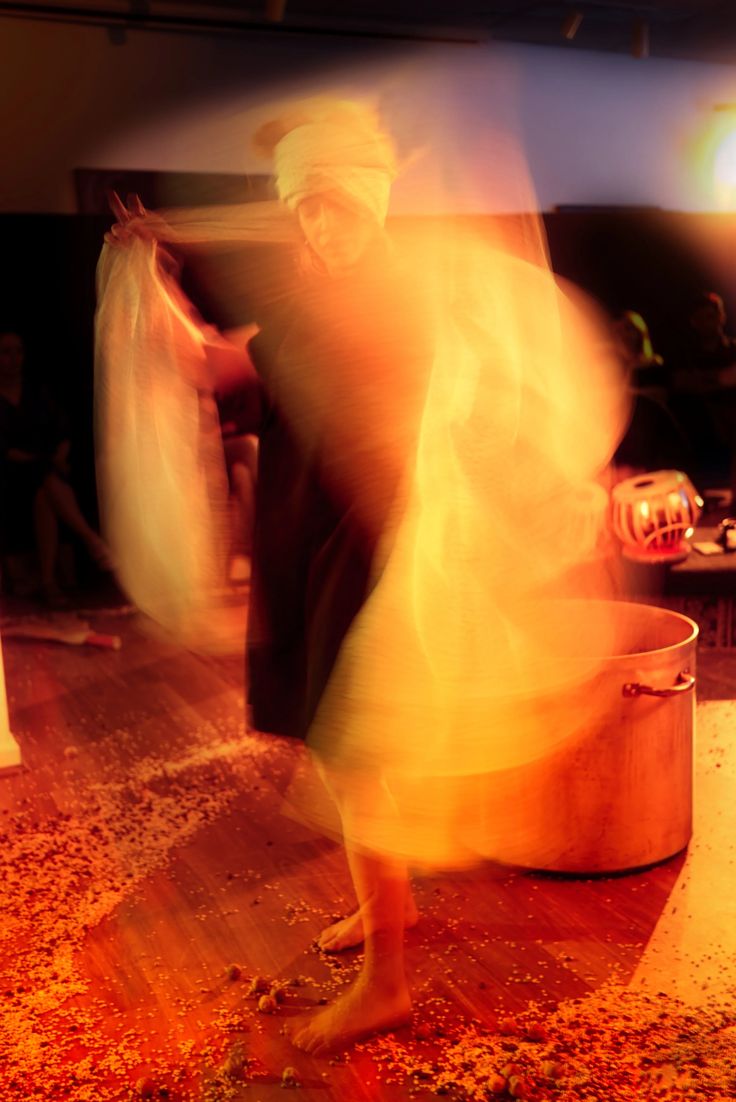 Dr. Elnaz Sheshgelani, an accomplished Iranian contemporary dancer, draws inspiration from traditional Persian dance to reimagine the ritual for the modern stage. She uses the chador (Iranian veil) and everyday cooking utensils—trays, skimmers, colanders, and beans—as poetic tools of storytelling. Her dynamic choreography embodies the essence of the ritual, seamlessly blending grace, strength, and innovation.